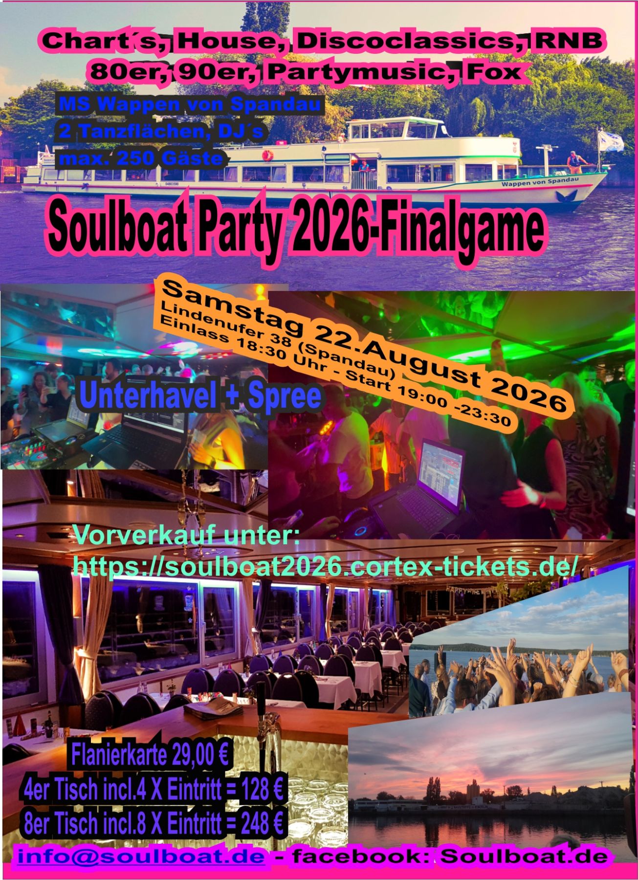 Compre boletos en línea. Venta anticipada del 22.03.2026 al 21.08.2026 Entradas para Soulboat 2026 FinalgameDie berühmten Bootspartys in BerlinMS Wappen von Spandau, Berlin Lindenufer 38Admisión a las 18:30 horas